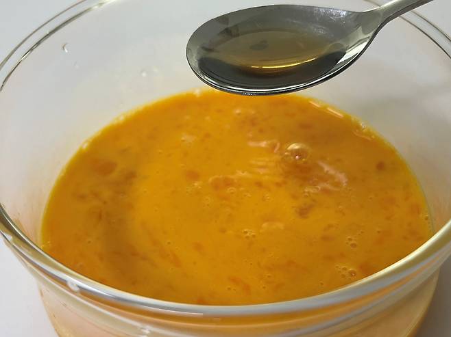 계란찜의 감칠맛을 끌어올리는 것, 바로 액젓인데요. 참치액을 1스푼 정도 넣으면 짠맛은 과하지 않으면서도 은근한 감칠맛이 살아나 훨씬 풍부한 맛을 냅니다. 참치액이 가장 무난하며, 비린맛이 심하지 않은 어간장 등을 추천합니다.