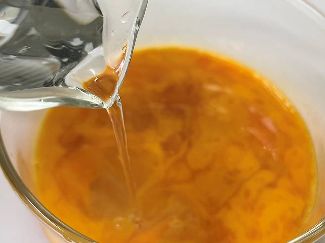이제 물을 부어서 계란과 섞어줘야 하는데요. 여기서 가장 중요한 핵심은 바로 찬물을 쓰지 않는 것입니다. 찬물을 계란찜에 넣으면 식감이 푸석해지고 갈라질 수 있습니다. 부드러운 식감을 위해서는 뜨겁지 않은 따뜻한 온도의 물 400ml를 부어서 섞어 주세요.