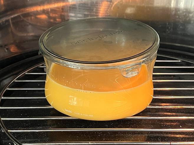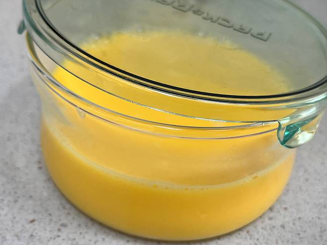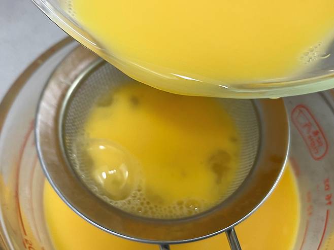 계란물이 체에 한 번 밭쳐서 걸러주면 알끈 등이 제거되며 더욱 매끄럽고 부드러운 계란찜이 됩니다. 귀찮더라도 이 과정을 생략하지 말고 해 주세요.