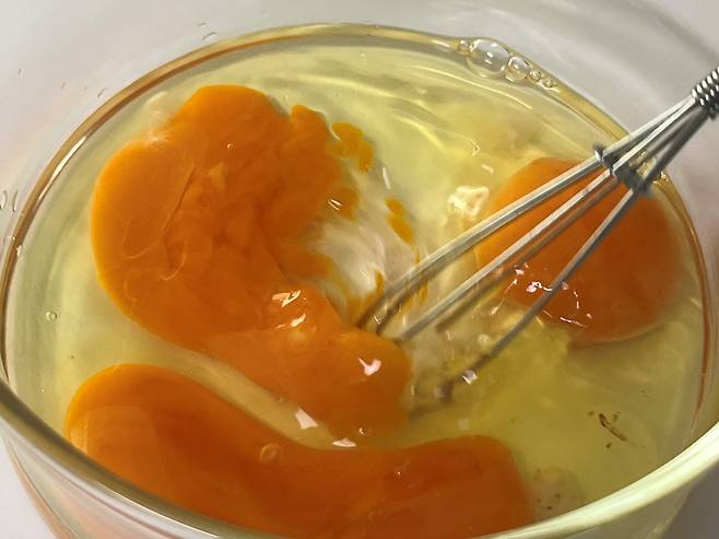 계란 4개는 그릇에 깨뜨린 다음 잘 풀어서 준비합니다. 계란찜은 계란이 최소 3개 이상은 들어가야 볼륨감이 생기고, 식감도 훨씬 부드럽게 나옵니다. 4개 정도 하면 약 2인분 양이됩니다.