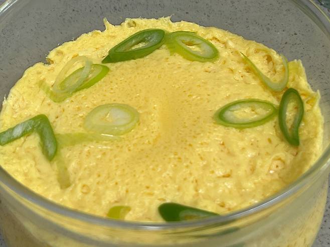 전자레인지에 약 4분 돌린 다음 파나 고명을 얹어 30초 더 돌립니다. 이렇게 하면 찜기 쓰지 않고도 맛있고 부드러운 계란찜이 됩니다.