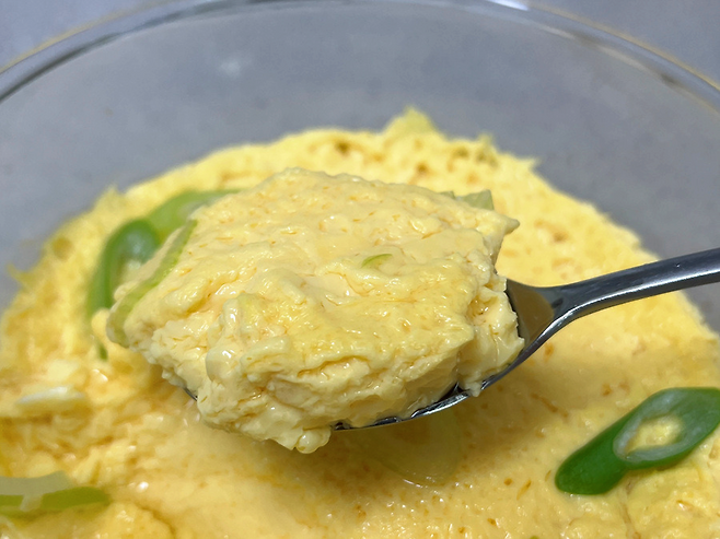마지막에 참기름 1스푼 뿌려서 곁들이면 고소한 향이 더해져 풍미가 한층 깊어진 부드러운 계란찜이 완성됩니다.