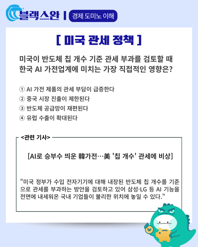 - 핵심 요약: 미국이 관세를 무기로 한국 기업에 대한 압박 강도를 더하고 있어 국내 업계에 비상이 걸렸다. 다음 달부터 당장 수출 의약품에 100% 관세를 부과하는 데 이어 전자제품에 들어간 반도체 수에 따라 관세를 물리는 방안까지 검토 중이라는 소식이 알려졌다. 월스트리트저널(WSJ)은 트럼프 행정부가 반도체 기업의 미국 내 칩 생산량과 수입량이 1대1로 일치하기를 원하며, 이 비율을 맞추지 못하는 기업은 품목관세를 내야 한다고 보도했다. 이는 지난달 미국 현지에 반도체를 생산하는 기업에 대해 관세를 면제하겠다던 기존 방침을 뒤집은 것으로 압박 수위가 훨씬 높아진 상황이다. 가전제품에 대한 품목관세 기준이 반도체 개수가 되면 AI 기능을 전면에 내세워온 삼성·LG 등 국내 기업들이 특히 불리한 위치에 놓일 수 있다. 국내 기업들은 대응책 마련에 돌입했지만 수시로 바뀌는 미 행정부의 입장으로 중장기적인 대응책 마련이 어려운 상황이다.