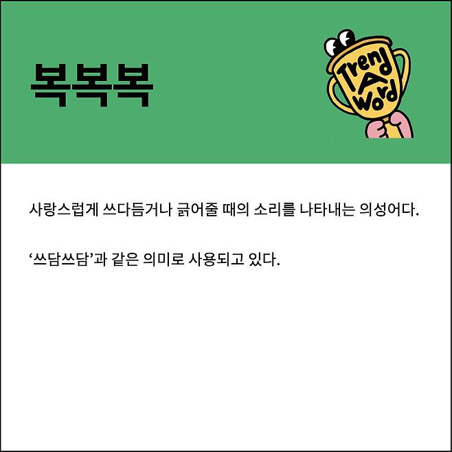 고생한 트집쟁이들에게 해주고 싶은 말이 있다. 바로 오늘의 트렌드 어 워드인 복복복! 요즘엔 ‘쓰담쓰담’ 대신 ‘복복복’이라고 쓴다고 하는데…