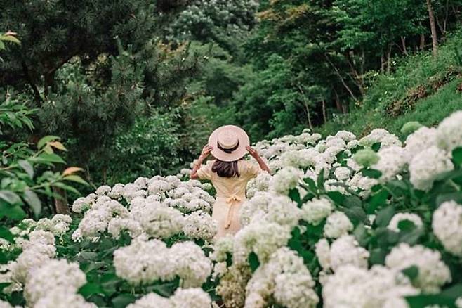 흰 수국길 사이로 펼쳐지는 여름 풍경