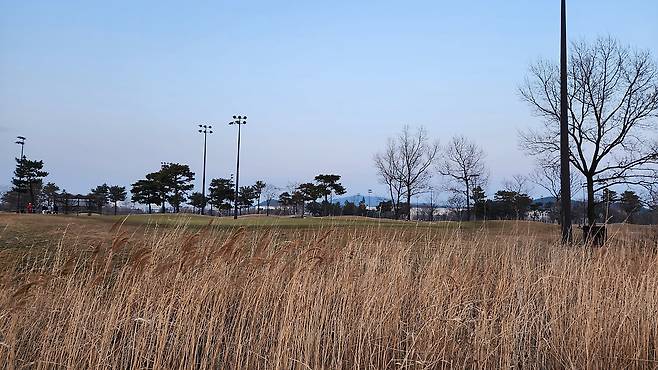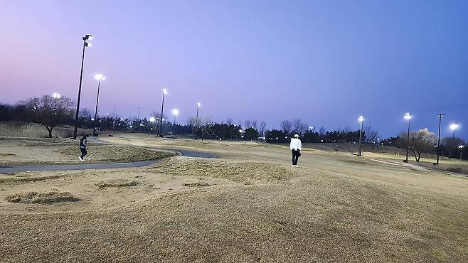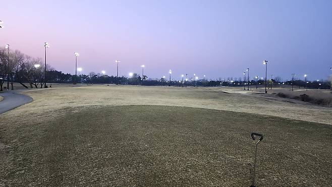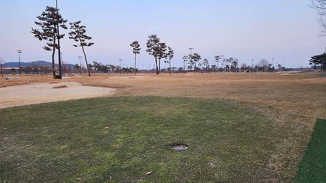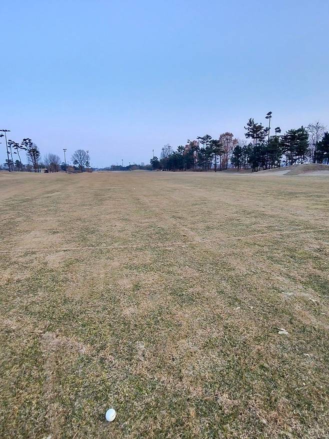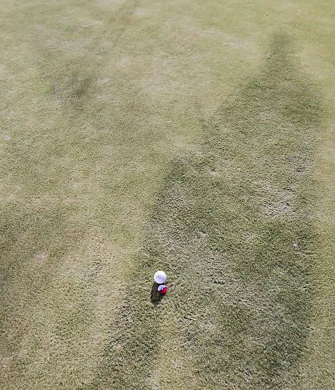 페어웨이 잔디는 메마르고 숨이 죽어있는데도 약간 질기기까지 한 느낌입니다. 보기에는 약간 서로 다름 잔디 품종이 섞여있어 보이기도 하네요. 시각적으로도 그리 좋아 보이지 않습니다.
