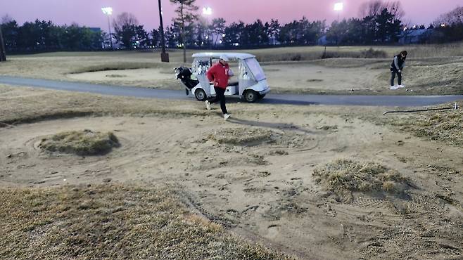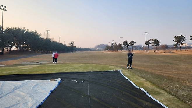 사진처럼 그린에 덮개를 사용해서 그 이상으로 망가지지 않게 보호하려는 모습이 자주 보입니다.
