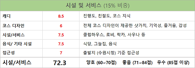 캐디의 코스 설명, 친절도 10점, 경기 진행 7점.