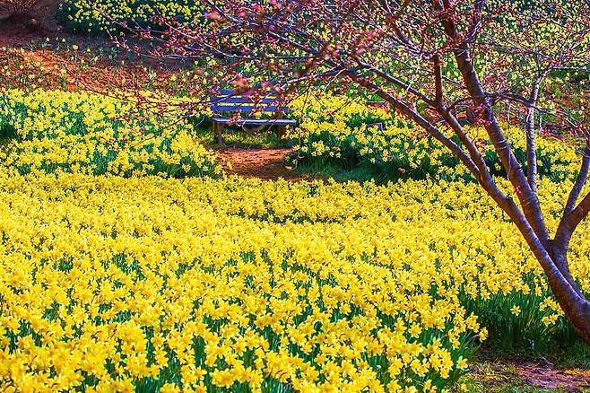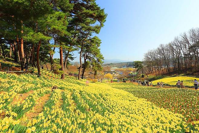 산등성이를 따라 펼쳐진 울창한 소나무 숲과 노란 수선화가 조화를 이루며 이국적인 분위기를 연출합니다.
