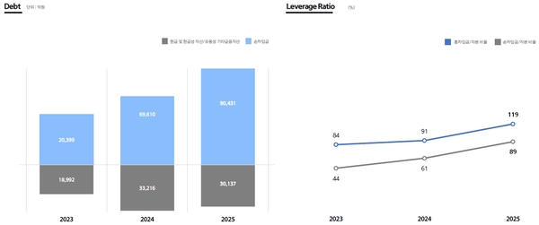 현금 및 현금성자산은 큰 변화가 없었다. 2023년 1조8892억원에서 2024년 3조3216억원으로 늘었지만 올해 1분기에는 3조137억원으로 다시 감소했다. 순차입금 비율은 119%다. 현금성자산보다 부채가 더 많은 것을 의미한다.