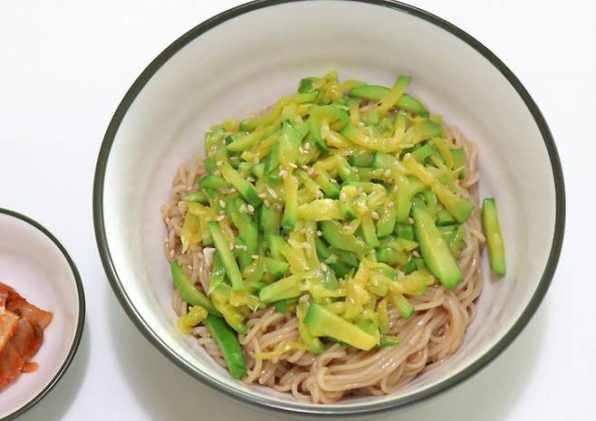 애호박 하면 보통 밥반찬으로 볶아먹거나 된장찌개에 넣어먹고는 하는데 이걸 국수로 만들어 먹으면 완전히 다른 맛이에요. 부드럽게 익은 애호박에 간장의 짭조름한 맛이 더해지면 정말 맛있어요. 자극적이지 않으면서도 깊은 감칠맛이 있어서 온 가족이 좋아할 그런 맛이에요.