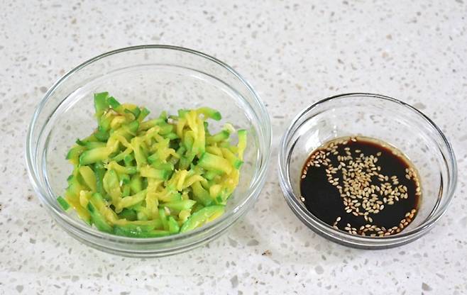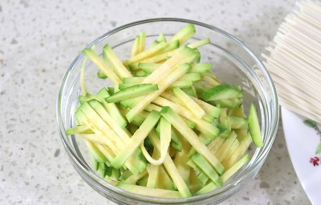 애호박 1개, 소면 1인분, 양파 ¼개, 대파 약간, 다진 마늘 반 스푼, 진간장 1스푼 반, 참기름 1티스푼, 매실청 반 스푼, 소금 한 꼬집, 통깨 약간.