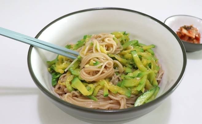 소면은 끓는 물에 넣고 3분 정도만 삶은 뒤 찬물에 헹궈 전분기를 빼줘요. 물기 털어내고 그릇에 담은 뒤, 볶은 애호박이랑 간장양념을 넣고 비벼주면 끝이에요. 마지막으로 참기름 한 방울, 통깨 솔솔 뿌려주면 고소한 향이 올라와요.