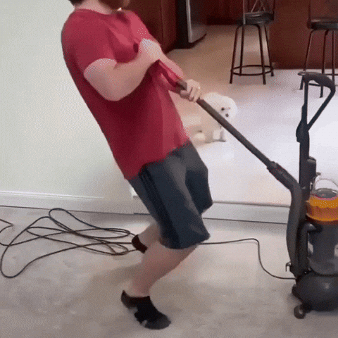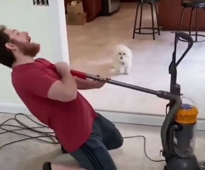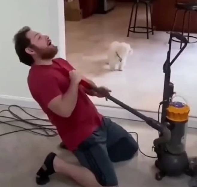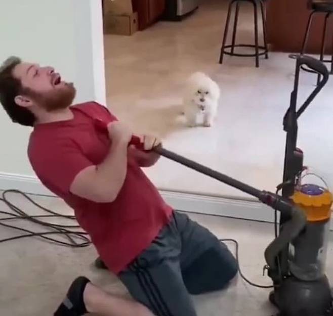 여기 실제로 강아지 앞에서 진짜 청소기에 빨려 들어가는 듯이 명연기를 펼치는 집사가 있습니다.