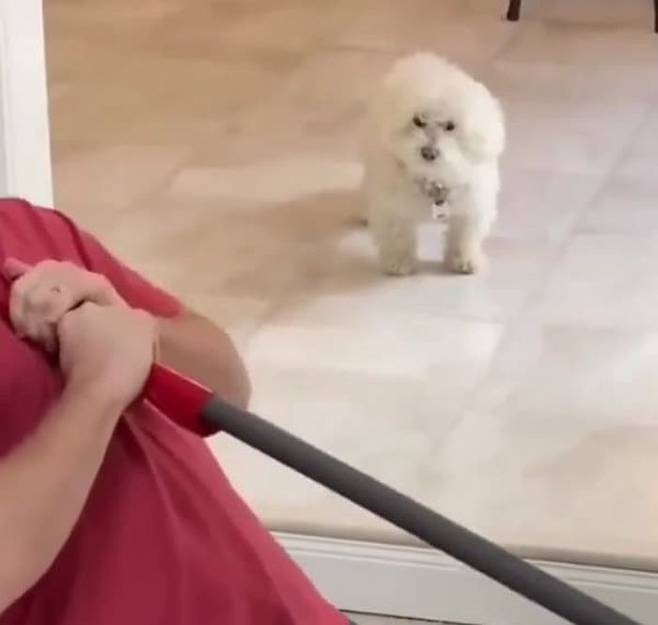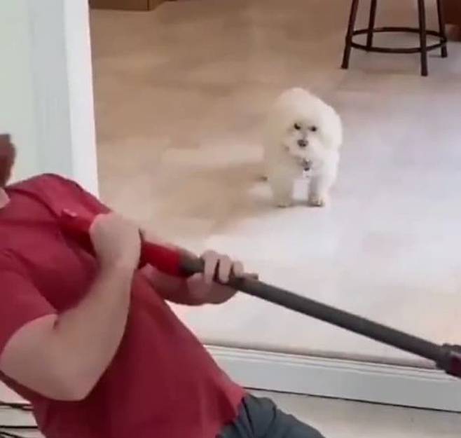 만약 강아지가 보는 앞에서 집사가 청소기에 빨려 들어가는 척 연기를 한다면 강아지는 과연 어떤 반응을 보일까요.