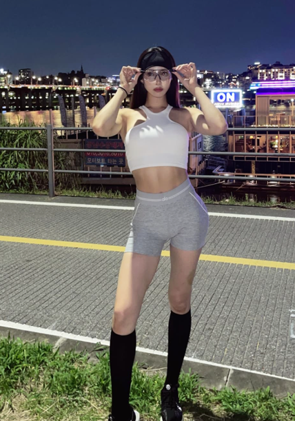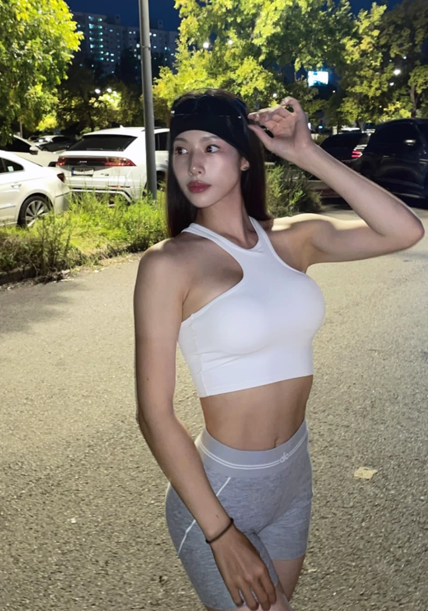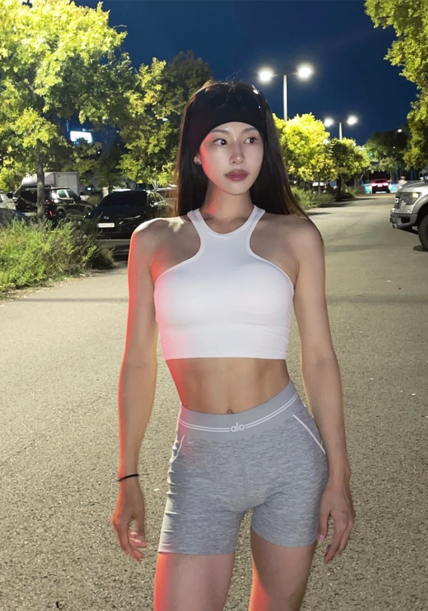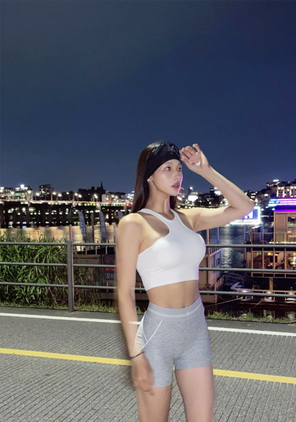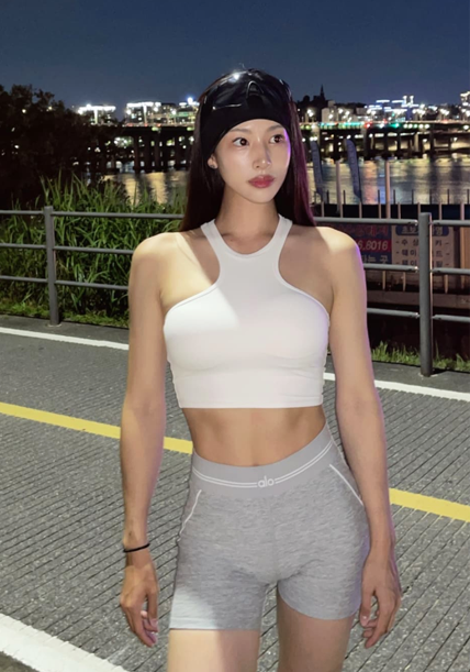 화이트 컬러의 크롭탑은 어깨와 쇄골 라인을 드러내며 스포티하면서도 페미닌한 무드를 더했고, 짧은 기장의 그레이 쇼츠는 탄탄한 보디라인을 강조해 전체적인 실루엣을 완성했다.