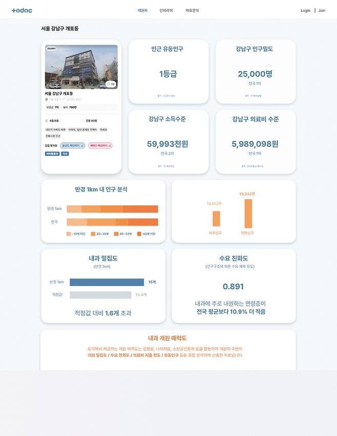 토닥은 단순한 정보 나열이 아니다. 해당 지역 소득 수준, 해당 지역 인구 밀도, 생활인구 및 유동인구, 해당 지역 요양급여 총액, 해당 지역 총 환자 수·특정 진료 과목 환자 수, 경쟁 병원 밀집도 현황, 반경 내 인구 분석(연령대별 구조, 직장인 인구 비율), 반경 내 인구 분석을 통한 수요 예측 정도, 역세권·시장 및 학교 유무 등을 종합적으로 판단해 종합 접수(매력도)를 제공하는 토탈 서비스인 셈이다.