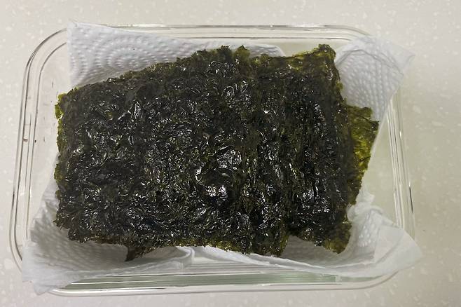 이럴 때 밀폐용기에 키친타월 깔고 김에 들어 있던 실리카겔을 넣어주세요.