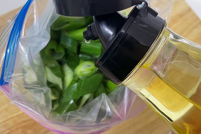 대파를 얼리면 오래가서 좋지만 자꾸 대파끼리 엉켜 붙어 떼어내기 힘들 때 있죠. 이럴 때 대파를 쫑쫑 썰어 물기 제거한 뒤 지퍼백에 넣고요. 식용유 몇 방울 넣어보세요