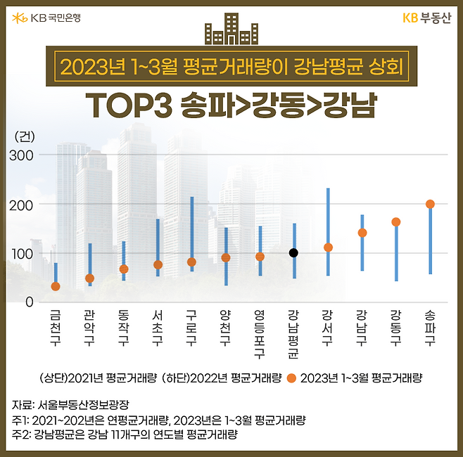 강남 11개구에 대한 올해 1~3월 평균거래량을 2021년, 2022년 평균거래량과 비교해 봤습니다. 강남구 구별거래량은 월평균 100건입니다. 2021년 160건에서 2022년 48건으로 하락한 이래 회복했습니다. 2021년의 0.6배 수준이나, 2022년 대비로는 2.1배 증가했습니다.