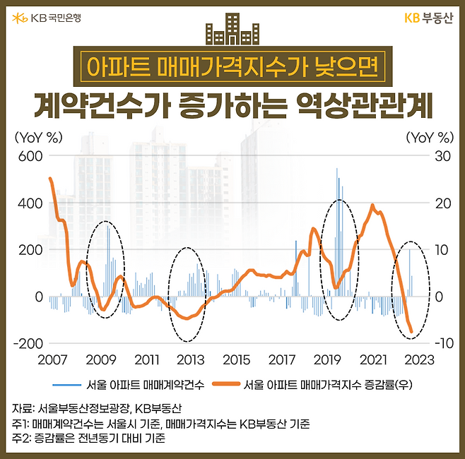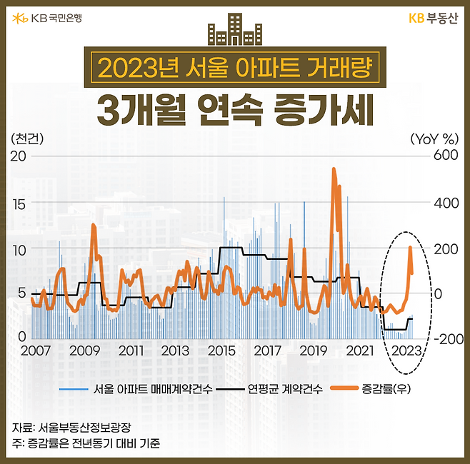 3월까지 평균거래량이기에 턴어라운드를 단정키는 어렵습니다. 2022년 하락기 거래절벽 국면에서 벗어날 수 있다는 기대감 정도로 보입니다. 전년대비 증가율은 확연히 반등했지만, 기저효과(基底效果)일 수도 있어 회복 기조의 추세성을 확인하려면 5~6개월 흐름을 더 봐야할 것 같습니다.