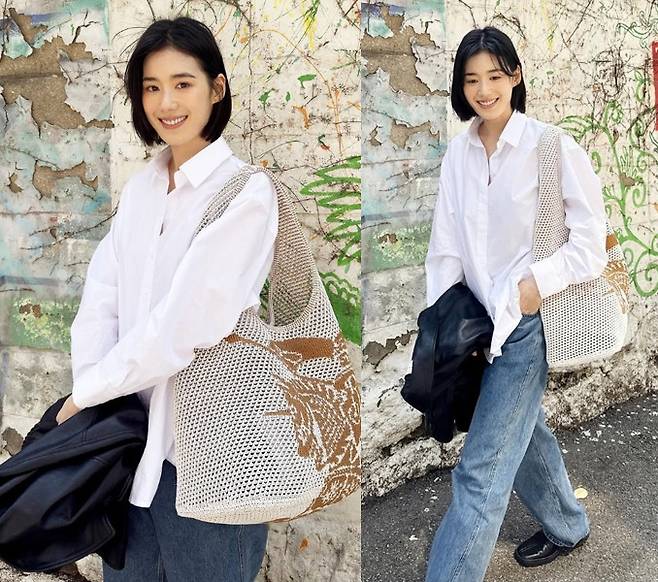 정은채는 자연스레 흐르는 오버핏 화이트 셔츠에 라이트워시 데님 팬츠를 더한 그녀는 단정하면서도 자유로운 분위기를 동시에 뽐냈고, 거친 벽화 배경과도 완벽하게 어우러지는 빈티지 감성을 보였습니다.