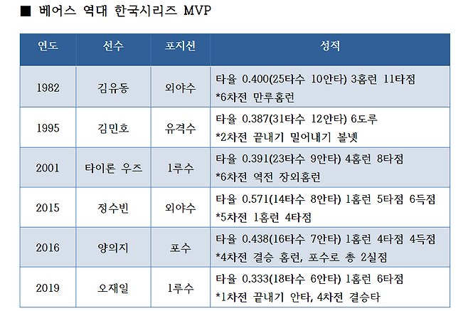 외국인선수 제도가 도입된 1998년엔 타이론 우즈가 KBO 최초 외국인 홈런왕에 올랐다. 그러면서 정규시즌 MVP까지 차지하는 기염을 토했다. 이어 2001년에는 올스타전과 한국시리즈 MVP를 연이어 따내면서 KBO 최초 'MVP 트리플 크라운'을 완성하는 주인공이 됐다.