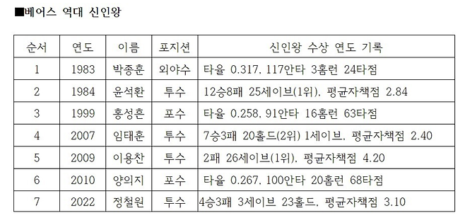 이를 바탕으로 베어스는 신인왕의 산실이 되기도 했다. 1983년 최초의 신인왕 박종훈을 배출했고, 1984년에는 윤석환을 신인왕으로 내놓았다. 2년 연속 신인왕 역시 KBO 최초 역사다. 이어 2022년 정철원까지 베어스는 총 7명의 신인왕을 탄생시켜 KBO 최다 신인왕 배출 구단이 됐다.