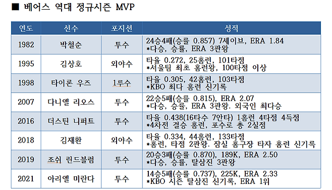 두산은 총 8명의 정규시즌 MVP를 배출했다.