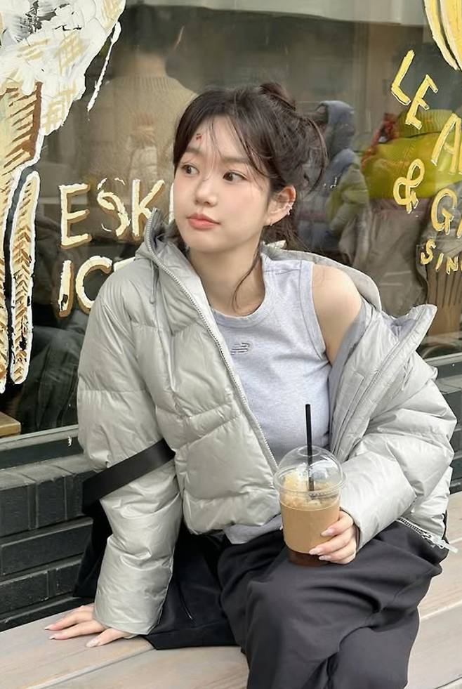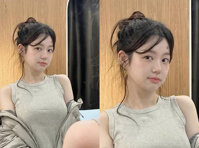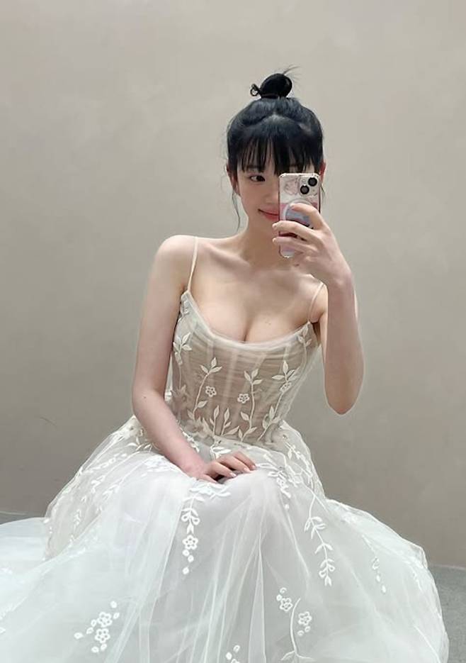 머리를 자연스럽게 위로 묶어 올린 이른바 ‘똥머리’ 스타일은 그의 얼굴선을 더욱 또렷하게 드러냈다. 높게 묶인 번 헤어는 이마와 턱선을 강조하며 작고 균형 잡힌 얼굴형을 더욱 돋보이게 했다. 과한 장식 없이 깔끔하게 연출된 스타일은 오히려 이유비 특유의 청순한 분위기를 극대화하는 역할을 했다.