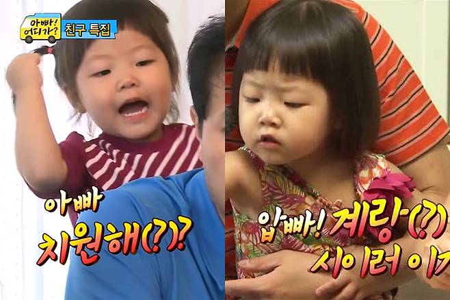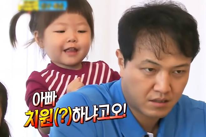 다윤 양은 눈을 위로 치켜뜨는 '봉주르 개인기'를 선보이거나, 어금니를 꽉 깨물고 "아빠 치원해?! 치원 하냐고~!!"라며 방망이 안마 솜씨를 선보여 웃음을 자아냈습니다.