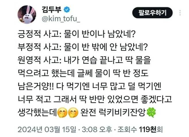대표적으로 원영적 사고로 긍정적으로 보낼 수 있었다.