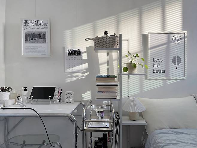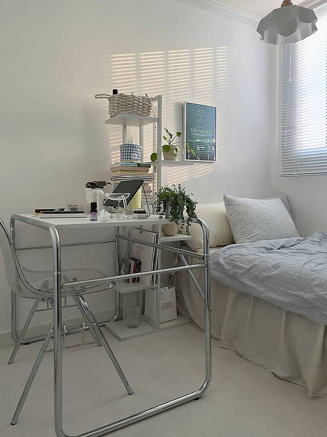 처음엔 생활감이 느껴지던 방, 어떻게 인테리어를 할까 고민하다가 먼저 '계획표'를 작성했어요. 콘셉트, 컬러감, 필요한 가구, 예산, 기간 등을 정리했죠. 이때 정한 계획을 기반으로 화이트와 블루를 주로 사용한 무채색, 미드 센추리 모던 공간을 만들고자 했어요.