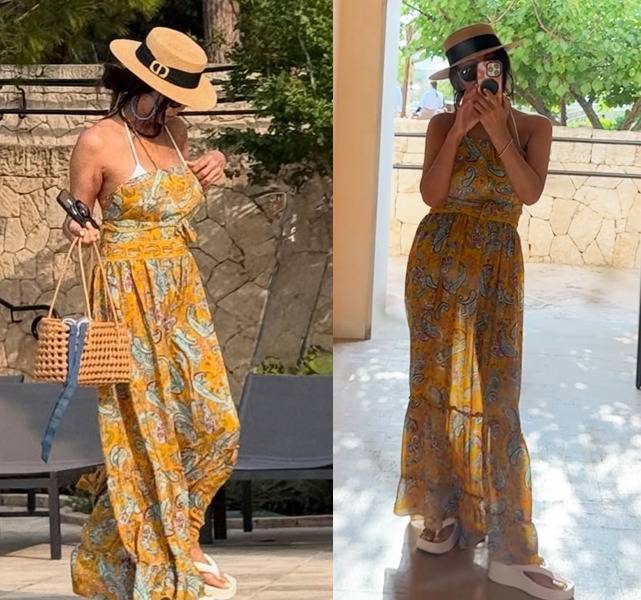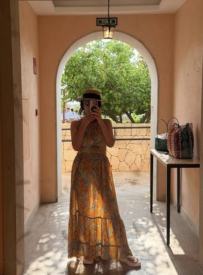 햇살 가득한 휴양지에서 황신혜는 화려한 페이즐리 패턴의 홀터넥 롱 원피스를 착용해 노출이 있지만 과하지 않고, 은근히 드러난 등라인과 날리는 자락에 고급스러운 여유를 담았습니다.