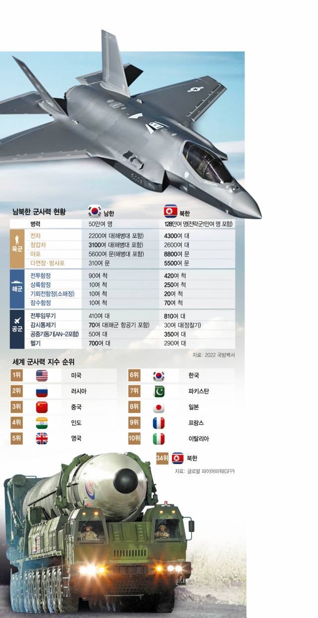 남북한의 재래식 전력만 놓고 보면 정전 이후 70년이 흘러 역전됐다고 할 수 있다. 객관적 지표로 미국 군사력 평가기관인 ‘글로벌 파이어파워’(GFP)가 지난 6월 초에 발표한 ‘2023년 세계 군사력 지수’를 보면 확인이 가능하다. 한국은 세계 6위다. 세계 최강 미국(1위), 러시아(2위), 중국(3위), 인도(4위), 영국(5위) 등 사실상 핵보유국을 제외하면 남한은 세계 최고 수준의 군사 강국으로 꼽혀도 손색이 없는 군사력을 갖췄다. 주요 7개국(G7) 국가 중 독일(25위), 캐나다(27위)보다 상위를 차지할 정도다.