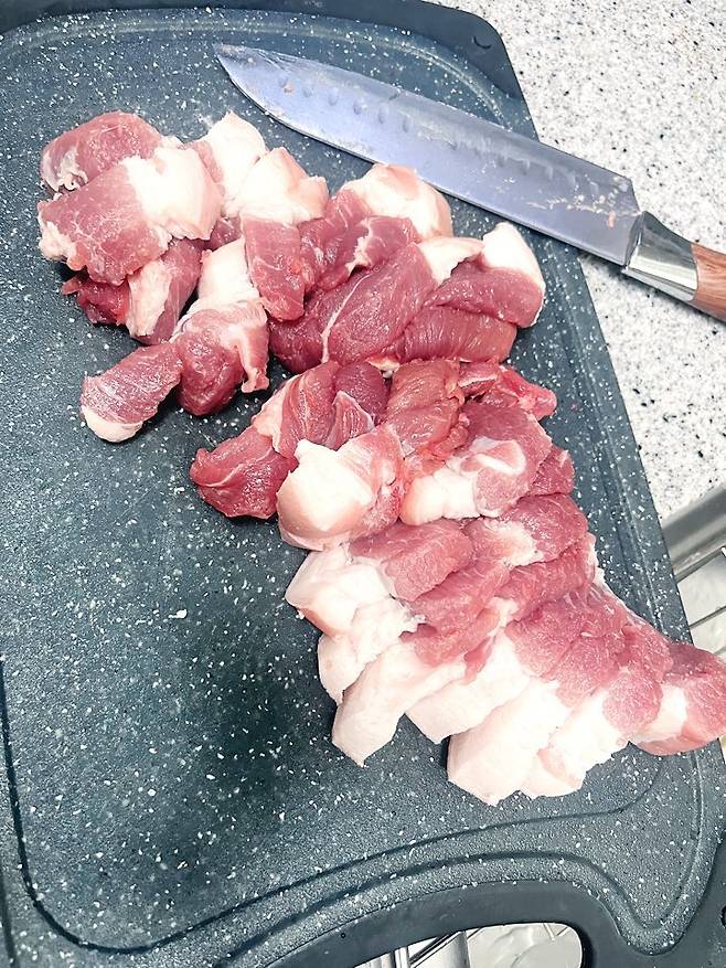 고기는 한입 가득 크기로 썰어서 설탕 한스푼 후추약간 청주 한잔 (소주 보드카 위스키도 무관) 손으로 주물 주물 해둡니다