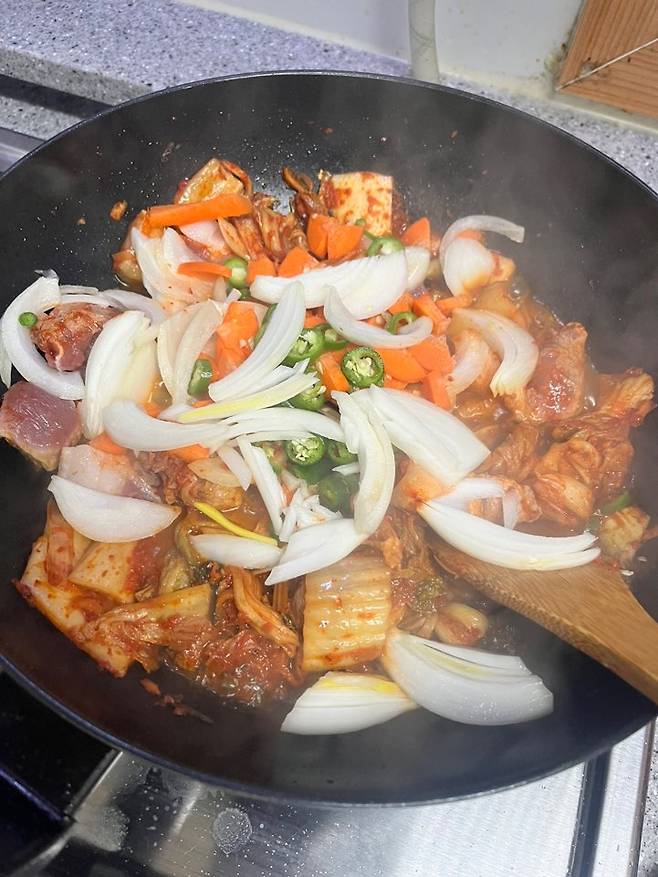 고기 넣고 싶으면 고기 넣고 참치캔 하나 까넣고 싶으면 그거 넣어도 되고 사실 꽁치던 뭐던 그냥 많이 때려 넣으면 됩니다