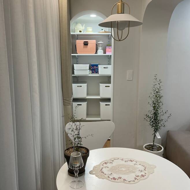 구축 24평 아파트에는 식탁 둘 공간이 애매해서 확장된 공간에 테이블과 의자를 두어 다이닝 공간으로 만들었어요. 확장된 공간을 아치로 만들어 공간이 분리된 느낌이라 좋은 거 같아요. 친구들이랑 음식도 만들어 먹고 소소한 파티를 즐겨요.