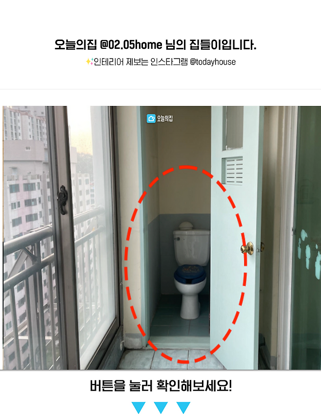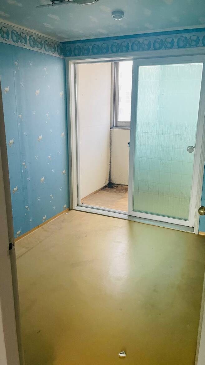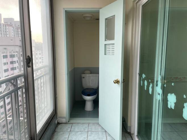 처음에 이야기한 없앤 화장실은 이곳입니다. 거실 베란다 쪽에 화장실이 있었어요. 여기에 화장실이 있는 게 저는 너무 놀랍고 신기했는데 예전 집은 많이 그렇다고 하더라고요. 이 공간을 잘 활용하면 아주 좋은 공간이 되겠구나 싶었어요.