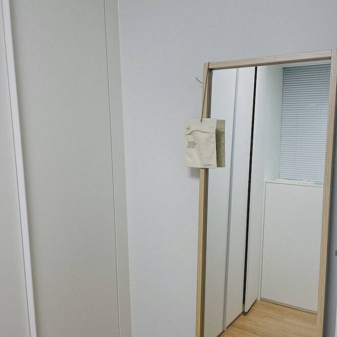 이외에 남은 공간에는 전신거울 하나와 청소기를 두어 작지만 알찬 드레스룸을 만들었습니다.