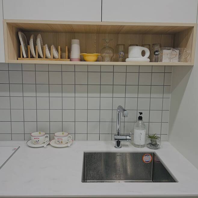 위에는 콘셉트에 맞게 우드 선반으로 만들어서 컵이랑 자주 쓰는 접시를 두고 있어요. 싱크 볼은 500사이즈로 조금 작지만 깊어서 작게 느껴지지 않더라고요.