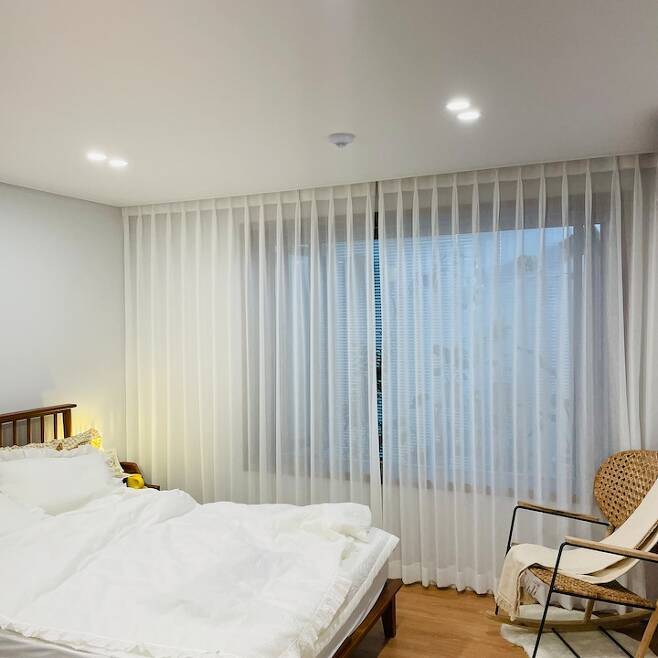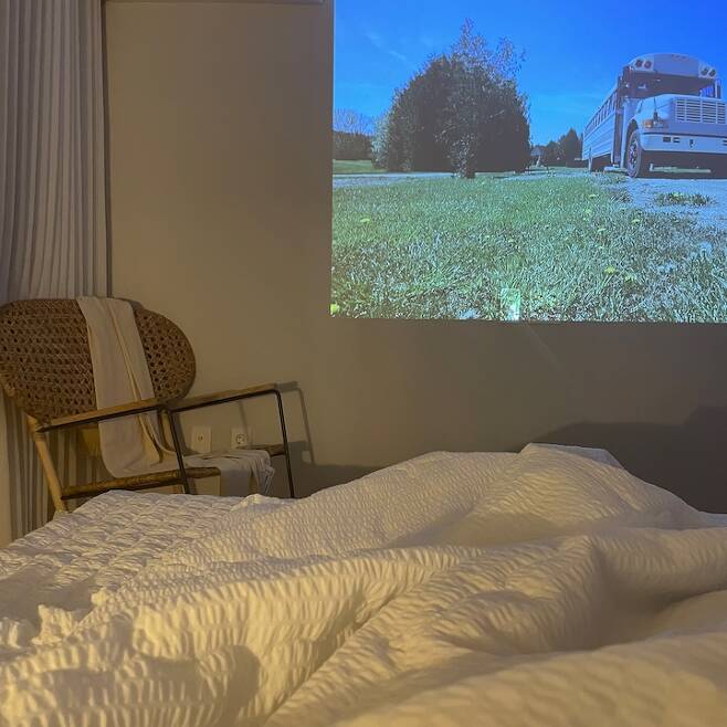저녁에는 침대에 누워 벽에 빔을 쏴서 보고 있어요. 침실은 제가 제일 좋아하는 공간이자, 가장 많은 시간을 보내는 힐링공간이에요.