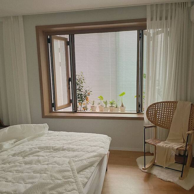 흔들의자를 두었더니 감성 숙소 같은 힐링 공간이 되었어요. 새로운 포토존 완성입니다.