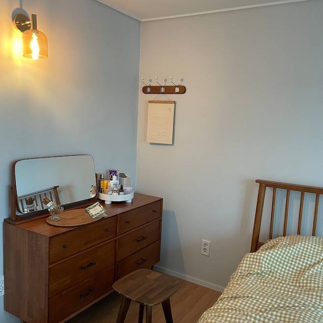 침대, 화장대, 협탁 모두 원목가구로 선택했는데 과하지 않고 폴딩도어와 아주 잘 어울려요. 화장대를 둘까 서랍장을 둘까 고민을 많이 했는데요. 드레스룸에 서랍장이 없어서 서랍장을 두고 위에 거울을 올려서 화장대로 사용하고 있어요. 생각보다 불편하지 않고 공간도 넓고 수납도 넉넉해서 좋아요.