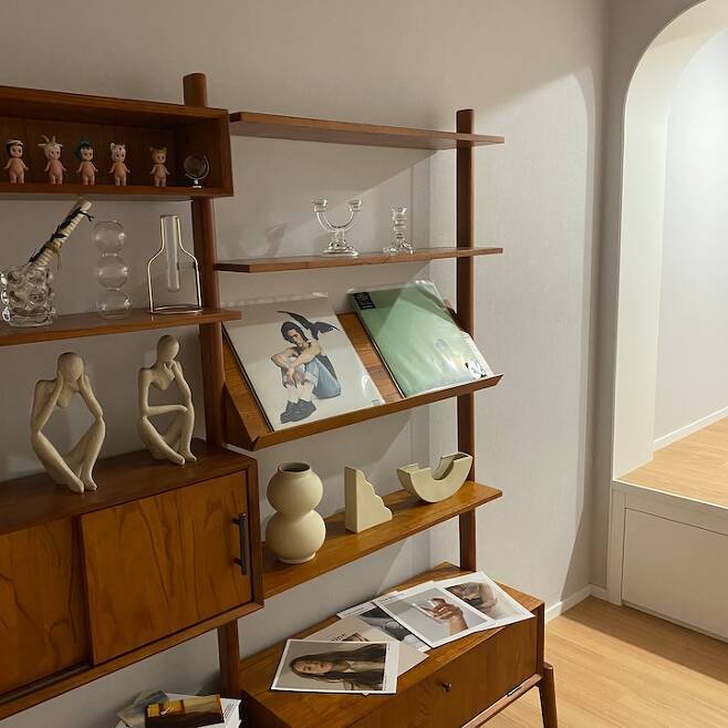 책장에는 오브제와 바이닐을 모아 두었어요. 카페 같은 느낌이 난다고 다들 좋아해요. 평상 인테리어가 고민이시라면 꼭 추천드리고 싶어요.
