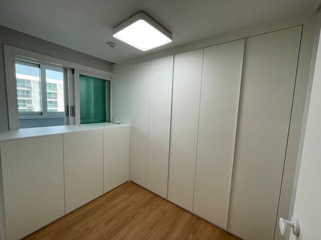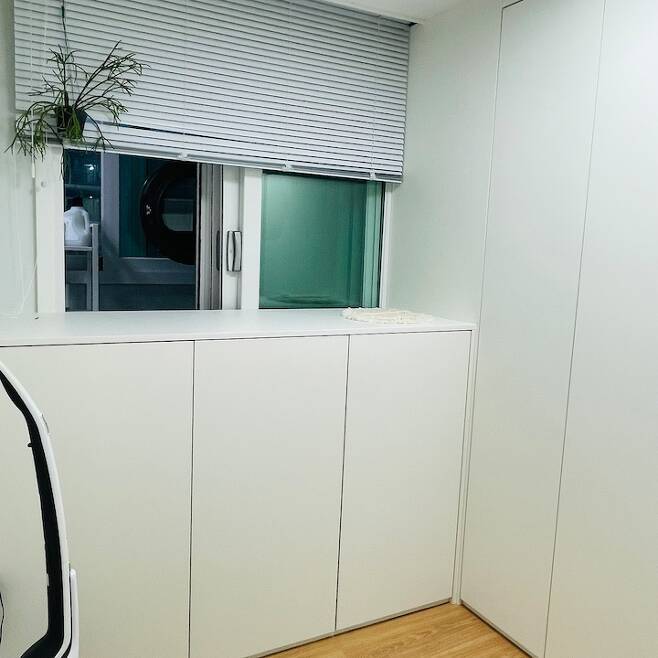 이렇게 세탁실이랑 연결되어 있답니다. 이 방에 어떻게 가구를 들일지 고민할 당시엔 우선 방의 한 면만 붙박이장으로 채우고 마무리를 지으려고 했는데요. 마지막에 창문 열고 닫는데 문제가 없을 만큼 낮은 장을 짜 넣었어요. 창문을 조금 가리긴 하지만, 안 만들었으면 큰일 날뻔했어요.