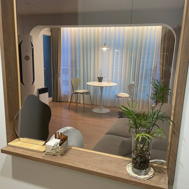 모루 유리를 하니 작은 집이라 너무 답답해 보일 수도 있겠구나 싶었어요. 그래서 가벽 쪽에 창문을 만들어 집에 들어왔을 때 거실이 다 보이게끔 했어요. 창문 아래쪽은 선반처럼 쓸 수 있게 만들어서 수경식물도 올려놓고 신발장에 거울이 없어 작은 거울도 올려두었답니다.