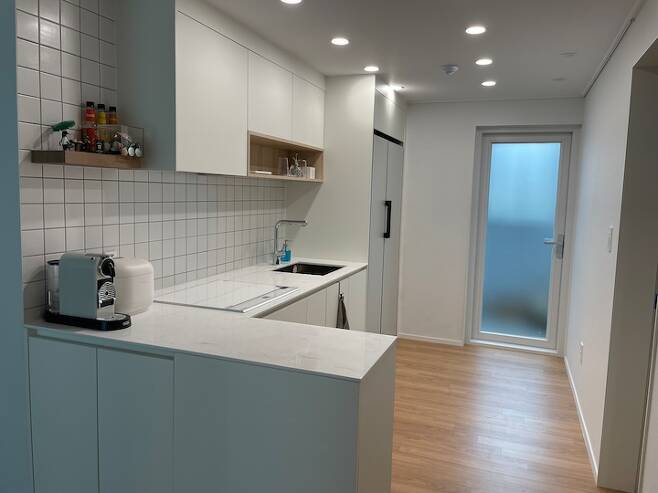 주방은 정말 고민이 많았어요. 다른 곳은 전부 제가 생각한 대로 했지만 구축 24평 아파트의 주방은 냉장고 위치 때문에 너무 어렵더라고요. 베란다를 확장하자니 주방 쪽 베란다에 보일러실이 있어서 할 수가 없었어요.
