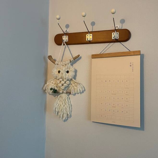 화장대 옆 공간은 바꾸고 싶을 때마다 한 번씩 이렇게 분위기를 내주기도 해요. 이렇게 취미로 배웠던 마크라메로 만든, 부의 상징 부엉이를 걸어두기도 합니다.