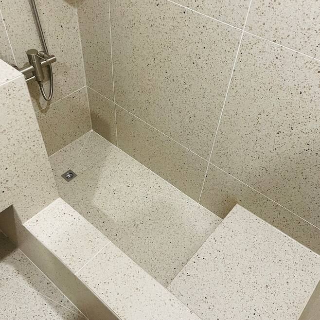 침실에 폴딩도어를 꼭 하고 싶던 것처럼 욕실에는 무조건 조적 욕조를 하고 싶었어요. 오피스텔에 살면서 욕조가 있는 집을 꿈꿔왔거든요. 근데 생각보다 화장실이 좁아서 조적 욕조는 무리라고 하시더라고요. 일반 욕조에 타일을 추천하시기도 했지만 목욕보다는 샤워 시간이 더 많을 텐데 일반 욕조는 불편할 거 같았어요. 조적 욕조를 긍정적으로 생각해 주시는 업체를 선택했고, 이렇게 예쁘게 완성되었어요.